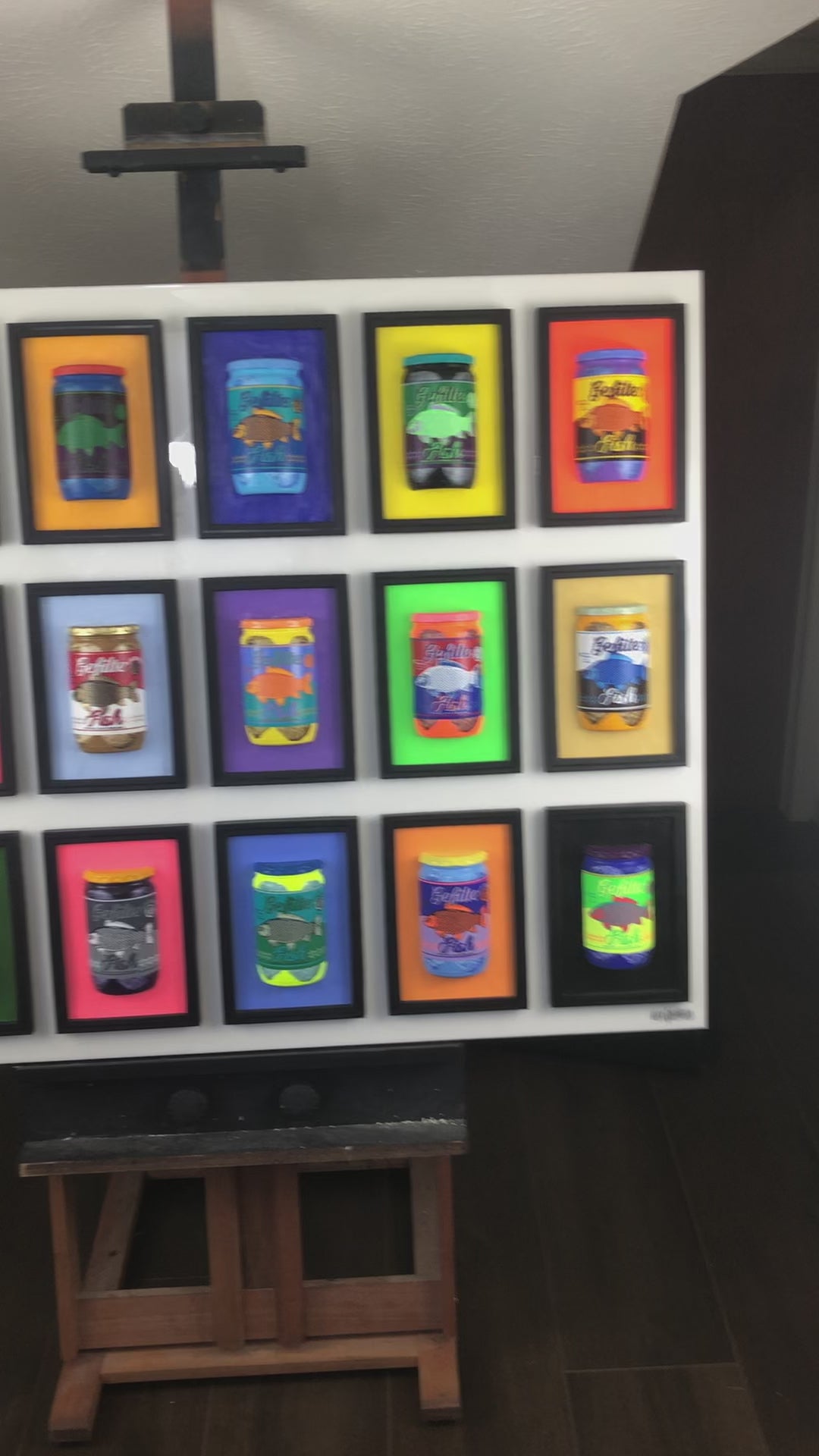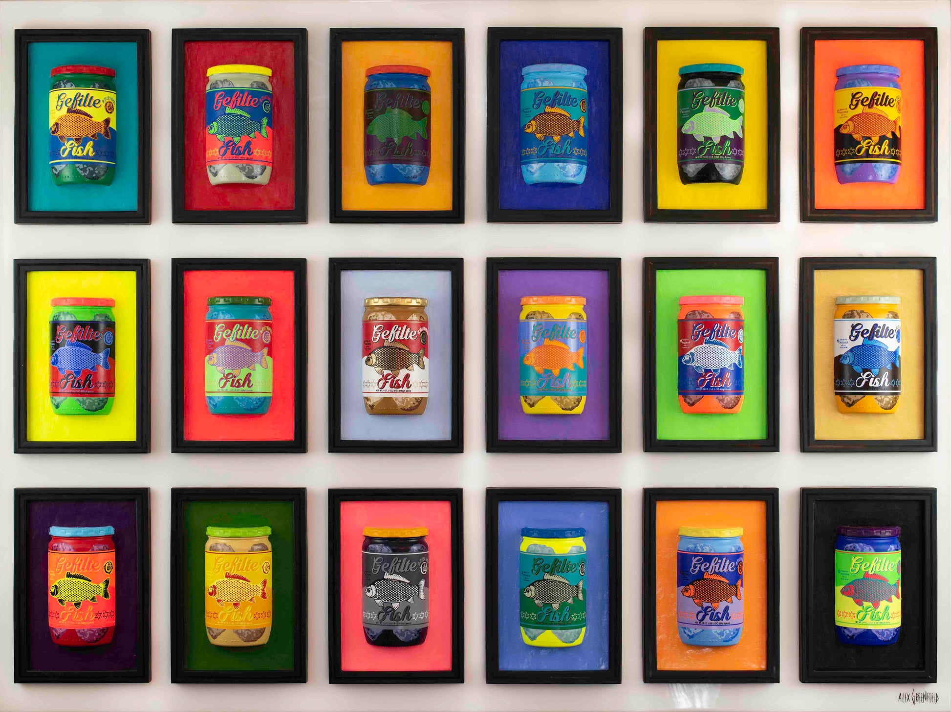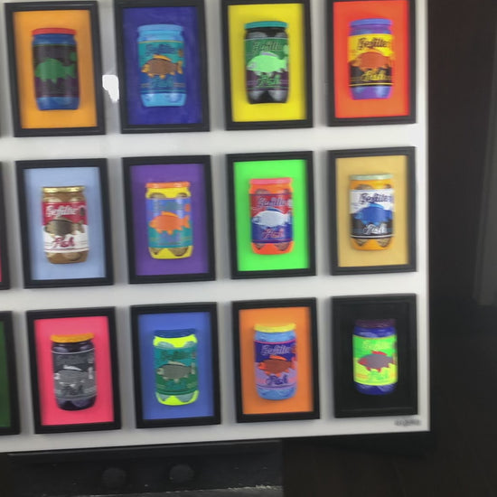Gefilte Fish is a playful and humorous reinterpretation of Andy Warhol’s iconic Campbell’s Soup paintings, infused with a distinctly Jewish cultural reference. Each jar is individually painted in its own color palette, transforming a familiar and nostalgic food into a bold pop art statement. Mounted on a pearlescent white background, the piece balances humor with visual sophistication, adding a touch of yiddishkeit to a classic pop art composition. The three-dimensional construction enhances its impact, making it both lighthearted and visually striking.