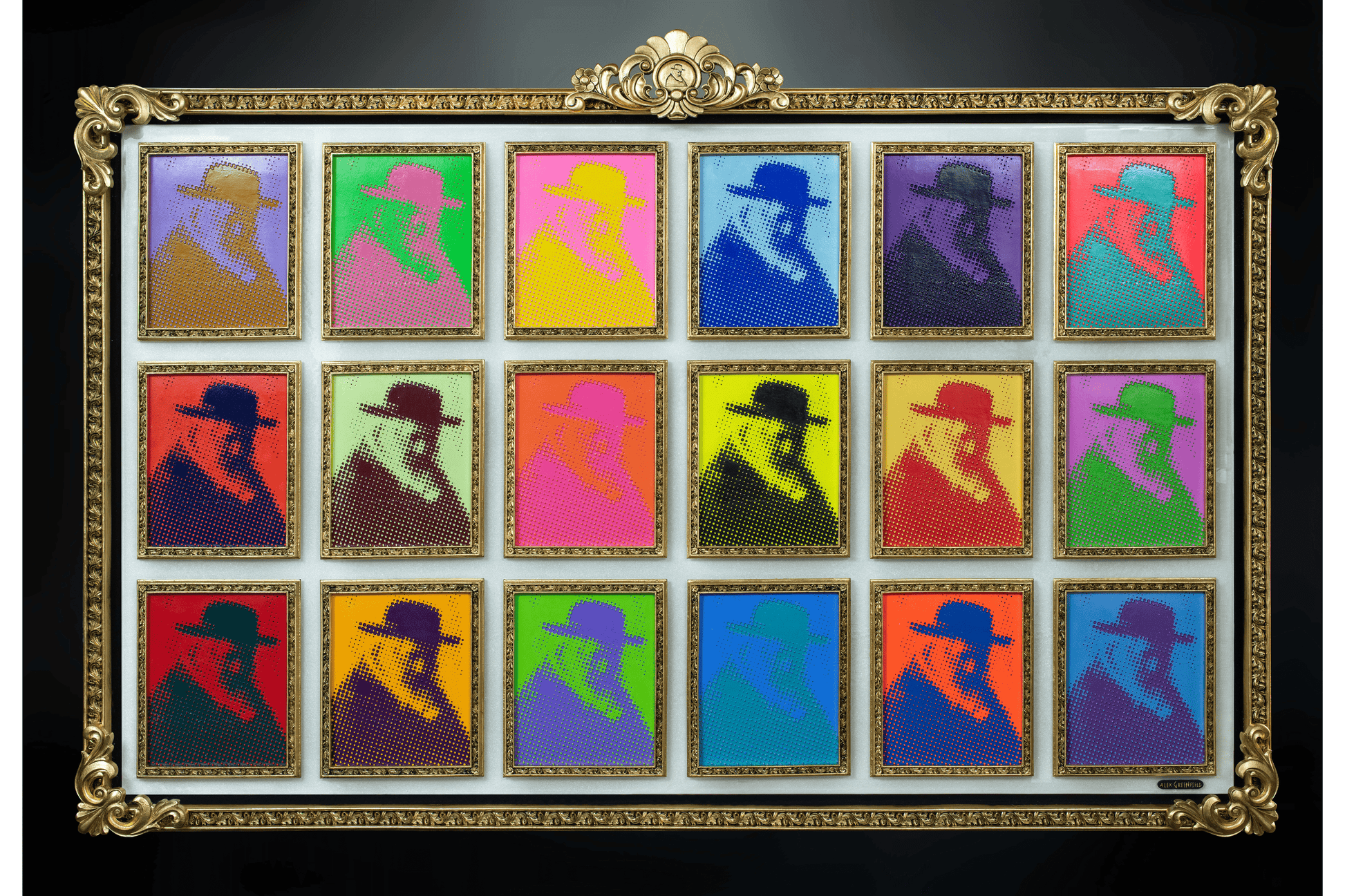 Warhol Shayele is a striking fusion of pop art and portraiture, blending the visual language of Andy Warhol with Roy Lichtenstein–inspired halftone techniques. The image is presented on a glossy holographic white background that subtly shifts color as the viewer moves, creating an interactive and dynamic viewing experience. Multiple images work together to form a cohesive composition, while the ornate, handcrafted rococo-style gold frame elevates the piece with a regal presence. A distinctive detail is the imprint of Reb